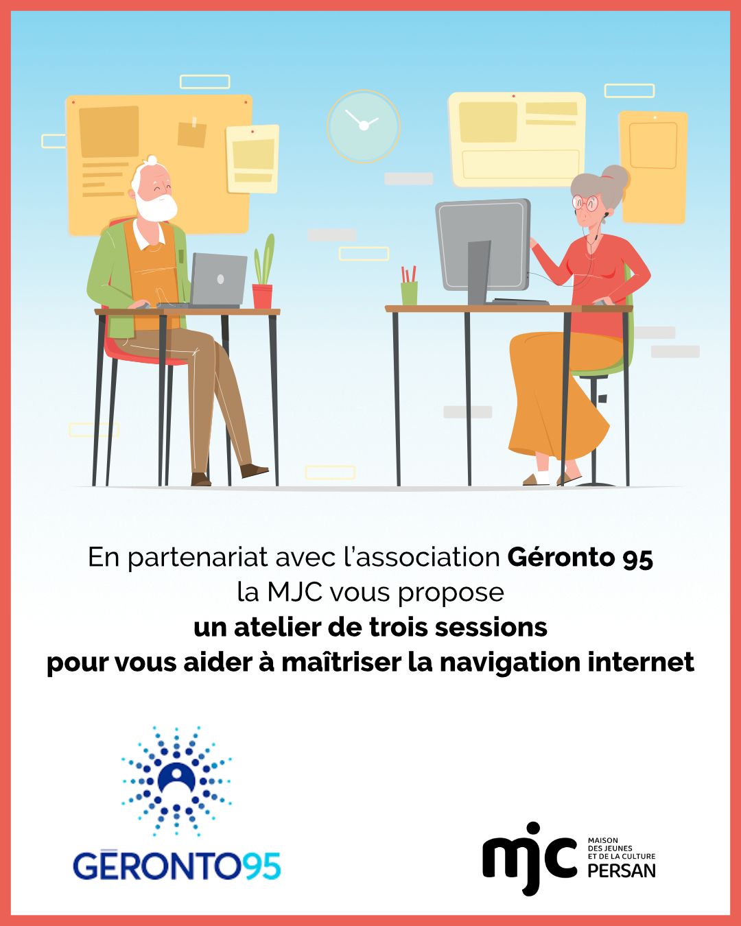 Parce que nous savons qu’être aidant c’est également gérer des démarches administratives qui sont parfois uniquement en ligne, l’équipe mobile des aidants portée par Géronto 95, propose d'animer un atelier de 3 sessions à la MJC pour vous aider à maîtriser la navigation internet.